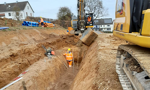 Im Kanalbau werden Schmutz- und Regenwasserleitungen über eine Strecke von etwa 1.000 m verlegt. Darüber hinaus werden Baugruben und Leitungsgräben mit einem Volumen von ca. 1.500 m³ ausgehoben. Der Einbau von etwa 30 Schächten aus Stahlbeton und Kunststoff ist ebenfalls Bestandteil des Projekts. Zudem werden Dichtheitsprüfungen sowie Kamerabefahrungen durchgeführt, um die Qualität und Funktionsfähigkeit der Leitungen zu sichern.